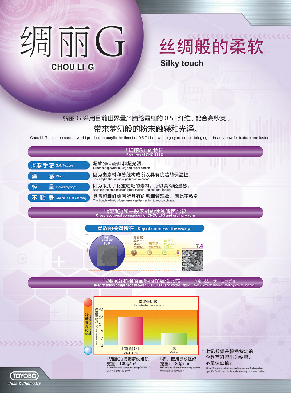 綢麗G采用目前世界量產(chǎn)腈綸最細(xì)的0.5T纖維,配合高紗支,帶來夢(mèng)幻般的粉末觸感和光澤。